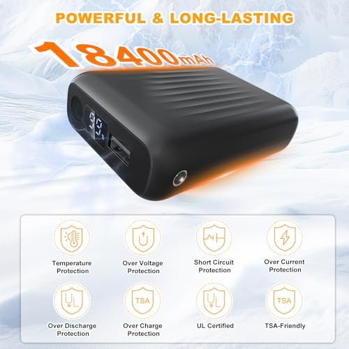 - 【 COMPACT DESIGN, HIGH CAPACITY 】The 18400mAh battery pack for jacket, made with high-energy cells, weighs only 280g. Despite its lightweight form, it's capable of charging your smartphone over two times.On high settings, heated vest battery pack can sustain warmth for 3-4 hours, 4-7 hours on medium, and an impressive 8-10 hours on low settings. Whether you're hitting the slopes, walking your dog, or just enjoying a casual stroll, our battery ensures you stay warm for longer periods.