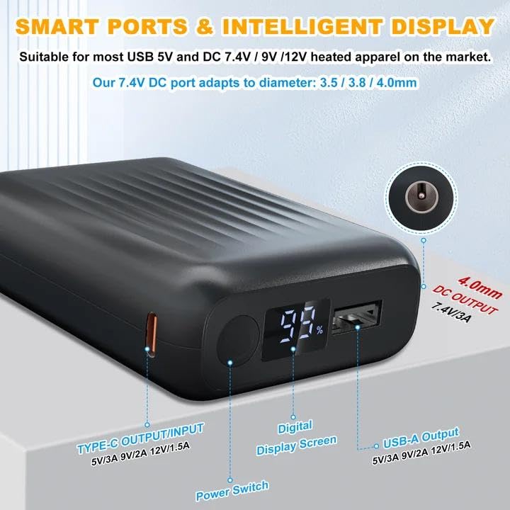 - 【 MULTIPLE FAST-CHARGING PROTOCOLS 】The heated gilet battery pack supports multiple quick charging protocols, with Type-C and USB A ports capable of smartly adapting to 5V, 9V, and 12V. It’s perfect for charging your smartphone and other USB-powered devices.