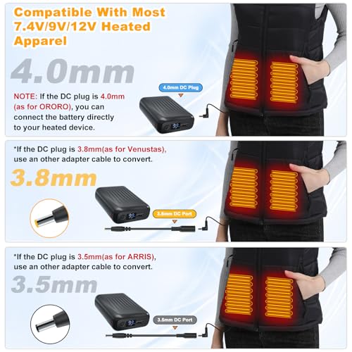 - 【 YOU WILL GET】You will get 1 x 18400mAh battery pack for heated vest, 1 x Instruction Manual, 1 x Type-C Cable, DC adapter*2. If your plug is 4.0mm (as for Ororo), you can connect the battery directly. If your plug is 3.8mm (as for Venustas) or 3.5mm, you can connect via the corresponding adapter.