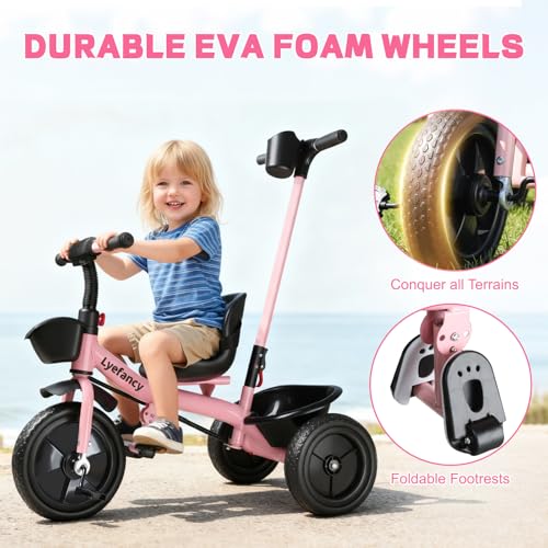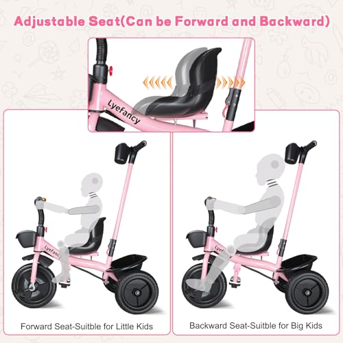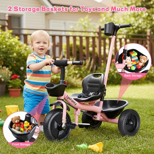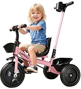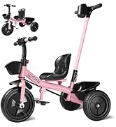 2 in 1 Kids Trike with Parent Handle for 1-4 Years, Kids Tricycle with Baskets and Removable Pedal, Adjustable Seat Toddler Tricycle, 3 Wheel Bike Gifts for Boys Girls Ride-On Toys(Pink)
