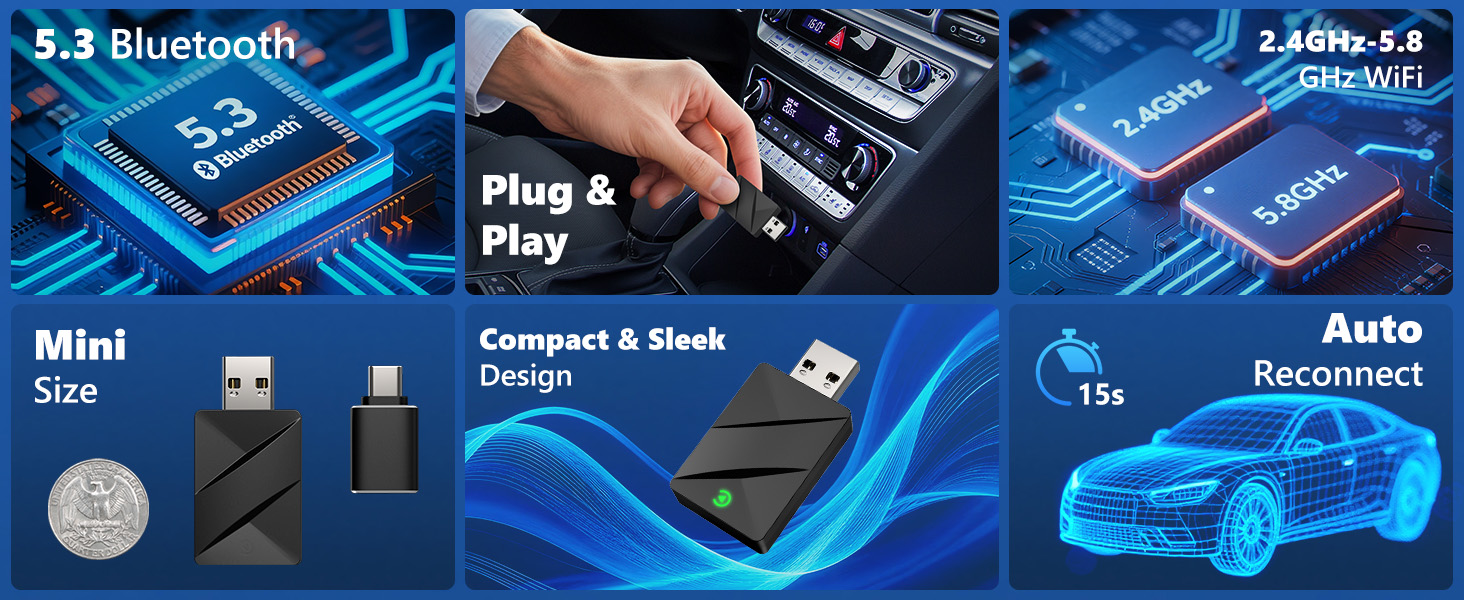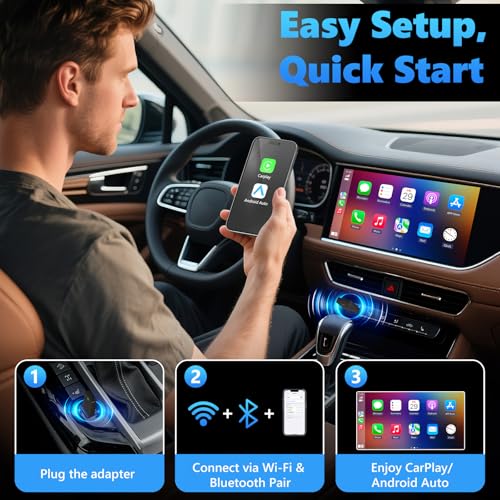 - 【 & 】 Equipped with 5GHz WiFi and optimized chip technology, this wireless Android Auto & CarPlay adapter ensures a low-latency, stable connection. Perfect for real-time navigation, music streaming, and voice commands without lags or interruptions.