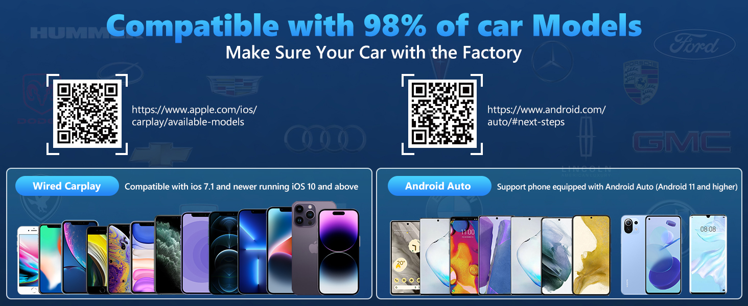 - 【 & 】 Compatible with 90%+ car models (2016 and newer) equipped with factory-wired CarPlay. Supports iPhone iOS 10+ and Android 11+ smartphones. Whether you drive a BMW, Mercedes, Audi, VW, Ford, Toyota, Honda, or other brands, this 2-in-1 wireless CarPlay and Android Auto adapter brings you a safer and more convenient driving experience.