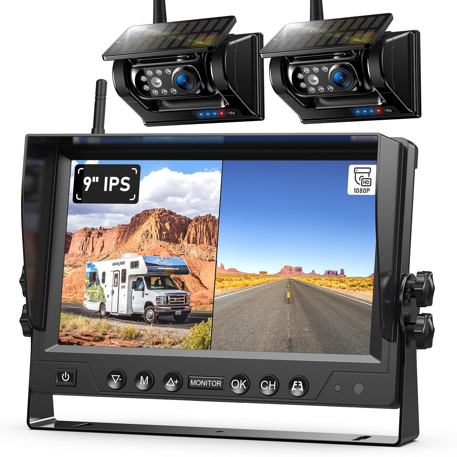 2 Magnetic Solar Wireless Reversing Camera Kit, 9 Inch HD 1080P Monitor, 1 Min Install, 9600mAh Rechargeable Battery, DVR Recording, IP69K Waterproof Reverse Camera for Trailer Van Motorhome