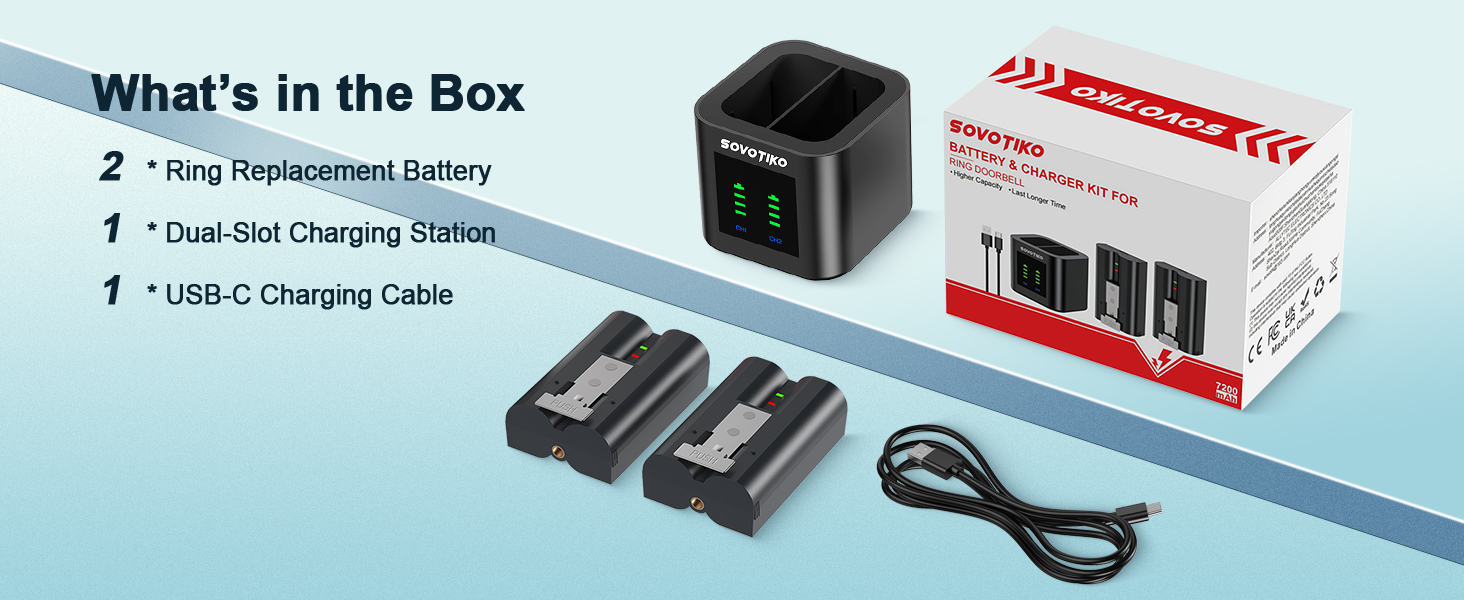- Full Compatibility: SOVOTIKO replacement battery is designed to be a high-quality power source for Ring-Video Doorbell 2/3/3Plus/4, Ring stick up camera battery (2nd and 3rd Gen), Ring spotlight camera battery, Smart Lighting Solar Floodlight, and Door View Cam.