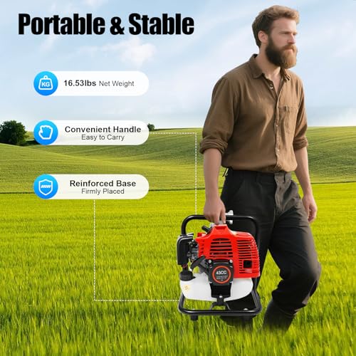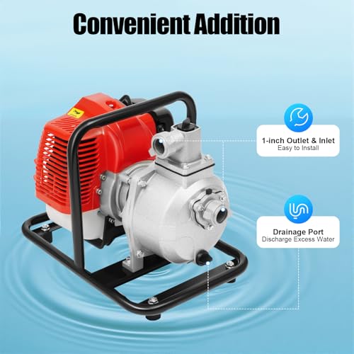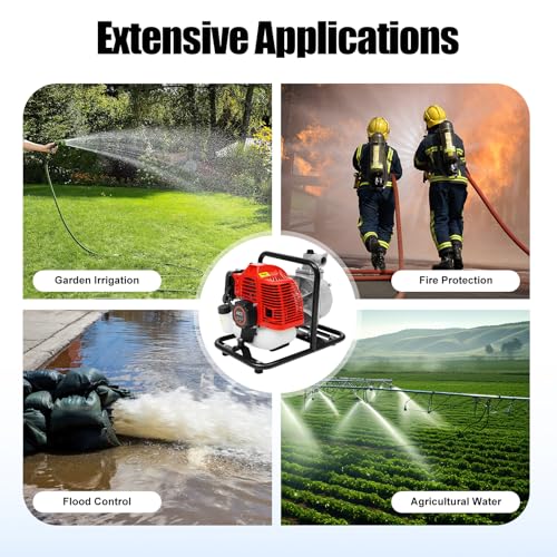 - Powerful & Efficient: The 2-Stroke 1.7HP 43CC Gasoline Engine Water Pump delivers 1.25 kW output power, ideal for irrigation, drainage, and water transfer, with a max flow rate of 35.66 gallons/min and a lift of 98.43 feet for fast water movement