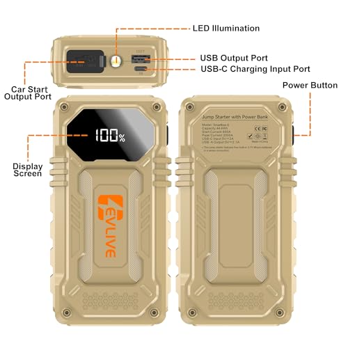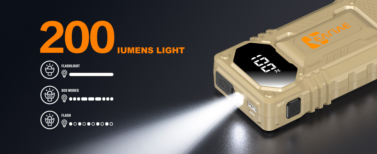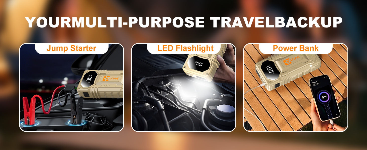 【Portable Power Bank & 3-in-1 LED Flashlight】 – Never be stranded without power. The integrated power bank with USB-C quick charge ports keeps your phones and devices charged. The bright LED flashlight offers 3 essential modes: Light, Strobe, and SOS for emergencies, camping, or roadside repairs.