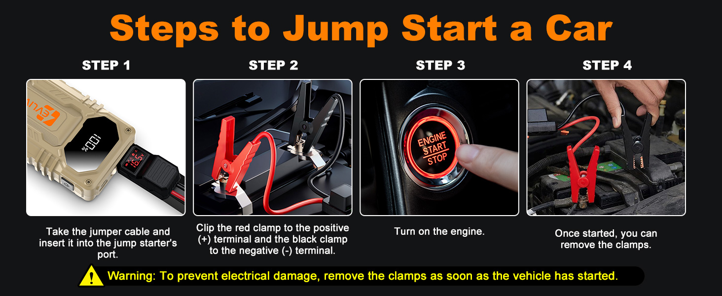 【Complete Kit & 24/7 Support】 – Everything you need is included: Smart Jump Starter Cables, USB-C Charging Cable, User Manual, and Storage Bag. Backed by a 1-Year Warranty and round-the-clock customer support, we respond within 24 hours to any queries.