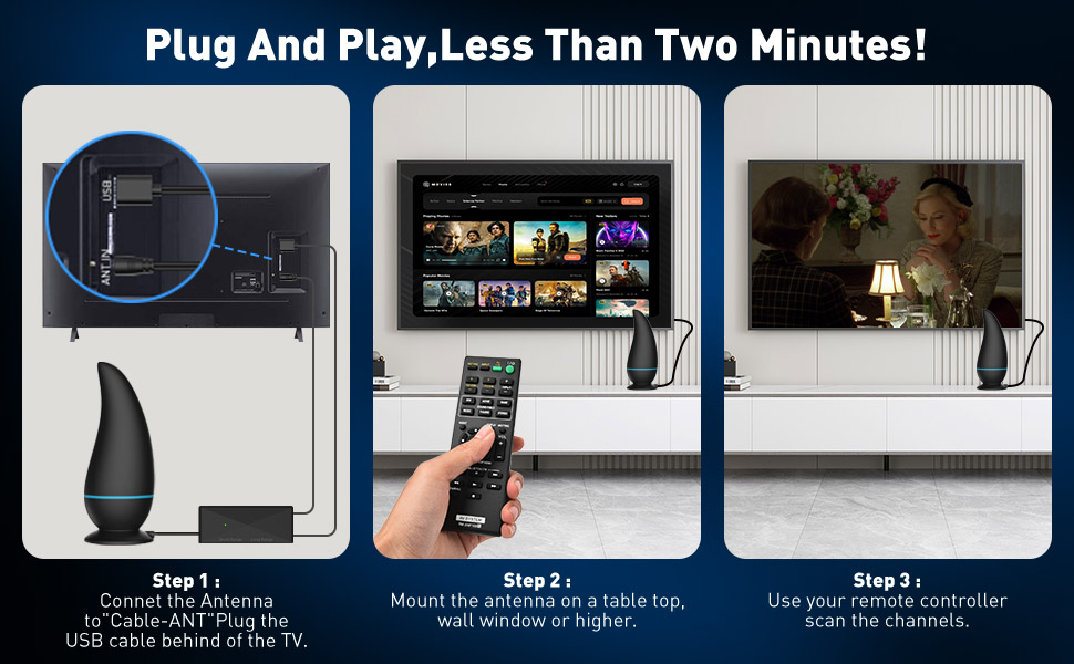 - 【Plug and Play】No need to download APP, no power supply required, just plug the digital TV aerial indoor into the Antenna/TV interface of the TV, and then perform automatic channel search in the TV menu to quickly complete the installation. Suitable for various brands and models of TVs or digital set-top boxes.