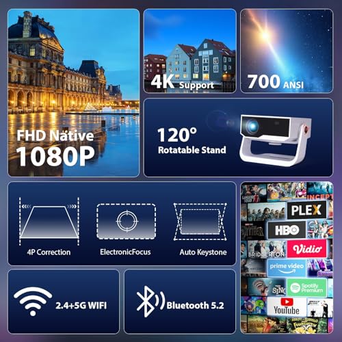 2025 Ultra Smart Projector Built-in Apps, 32000 Lumens,Full HD 4K Supported, WiFi 6 & Bluetooth 5.2, Low Fan Noise (<29.8dB), Auto Keystone, Portable Movie Projector for IOS/Android/PS5