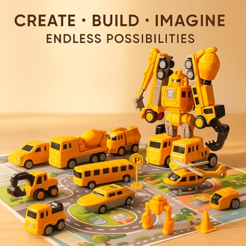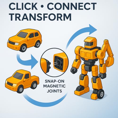 - 7-in-1 Transform Magnetic Robocar Set Kids can build 7 different robot cars and construction vehicles using strong magnetic joints. Each piece clicks firmly to promote creativity, coordination, and imaginative engineering play.