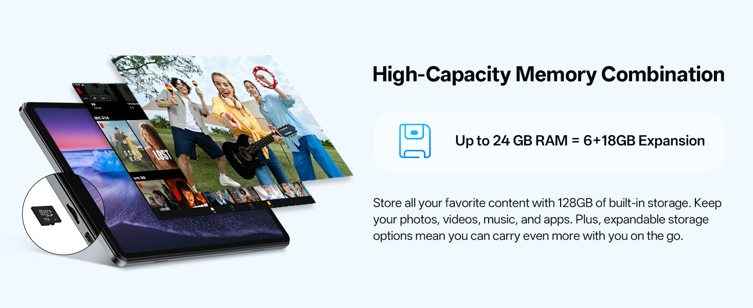 Ample Storage & Memory – With 128GB of built-in storage—expandable up to 1TB via TF card—this tablet offers abundant space for your movie collections and family photos. Its 24GB LPDDR4 memory (6GB physical + 18GB virtual) enables smooth multitasking and instant content access.