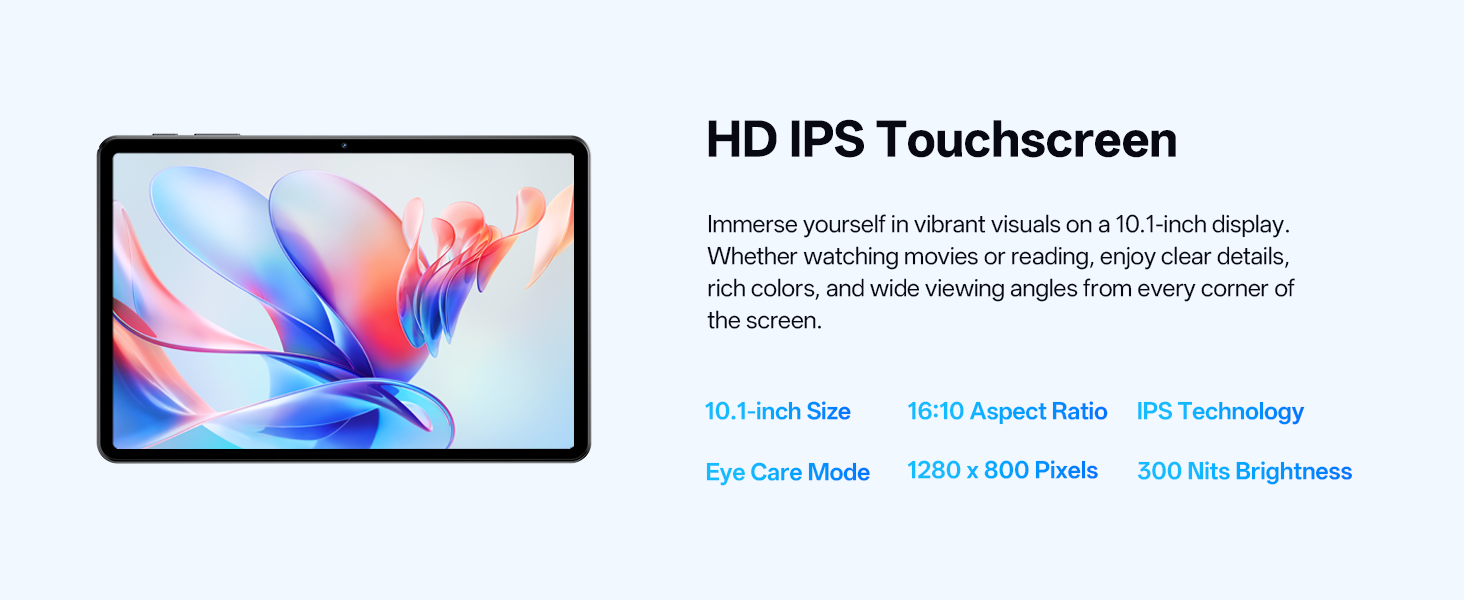 Vivid Eye-Comfort Display – The 10.1-inch IPS HD screen delivers clear and vibrant visuals, ideal for video watching, web browsing, and comfortable reading. An Eye Comfort mode with adjustable color temperature effectively reduces blue light emission during extended use.