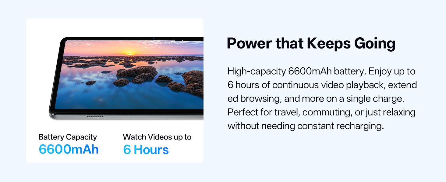 Stable Connectivity & Battery – This Android 15 tablet supports dual-band Wi-Fi for significantly improved connection stability and speed, along with Bluetooth 5.0 for easy pairing with wireless accessories. A 6600mAh battery supports up to 6 hours of continuous video playback.