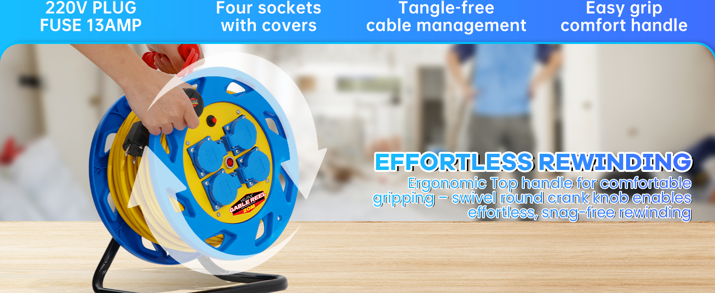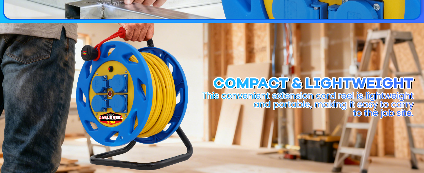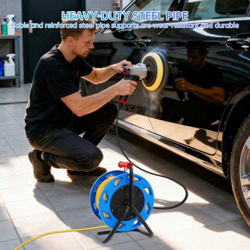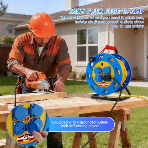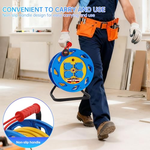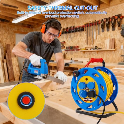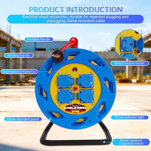 【Tangle-Free Operation】–Designed with a built-in winding handle, this power cable reel keeps your lead organized and ready to use. The extra-long 20m cable can be fully unwound in seconds, and once finished, it rewinds effortlessly with the help of the built-in cable guide, preventing tangling. The sturdy metal frame includes a convenient carry handle for easy transport, while the wide base ensures stability when standing.