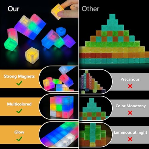 - Luminous Magnetic Building Blocks: Each 2×2 magnetic building block contains an LED light that can emit bright light, bringing a super cool building experience, especially suitable for night games, stimulating your imagination