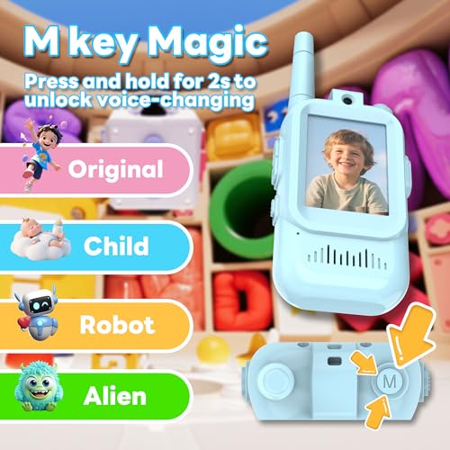 - 【Fun Voice Switching】The Video Walkie Talkies includes four entertaining voice modes,press and hold the M key for two seconds to activate the fun voice-changing feature,that add extra fun to every conversation.Great for sparking creativity and imaginative play during playdates.
