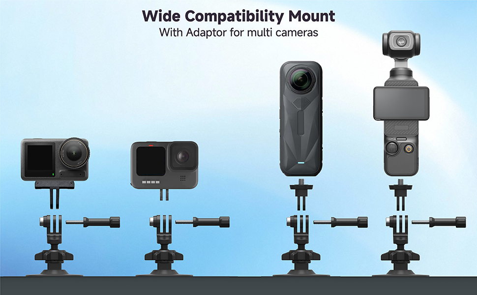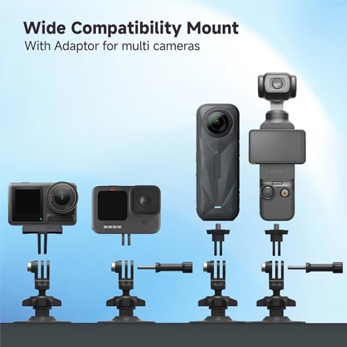 - Universal Mounting: Equipped with 2 pcs of 1/4" adapters, the car mount kit boasts wide compatibility with mainstream action cameras compatible for Insta 360 X5/X4/X3/X2/Ace/Ace Pro/Ace Pro 2/GO 2/ GO 3/GO 3S/ONE R/ONE RS/ONE X/ONE X2, for Dji Osmo 360/Action 5Pro/4/3/2/Pocket 3/2, for Go Pro MAX/HERO 13/12/11/10 etc.