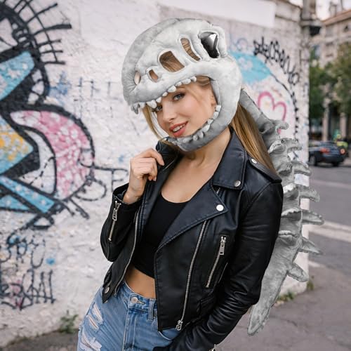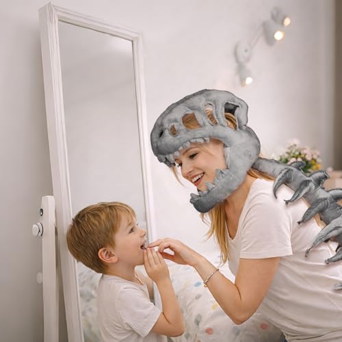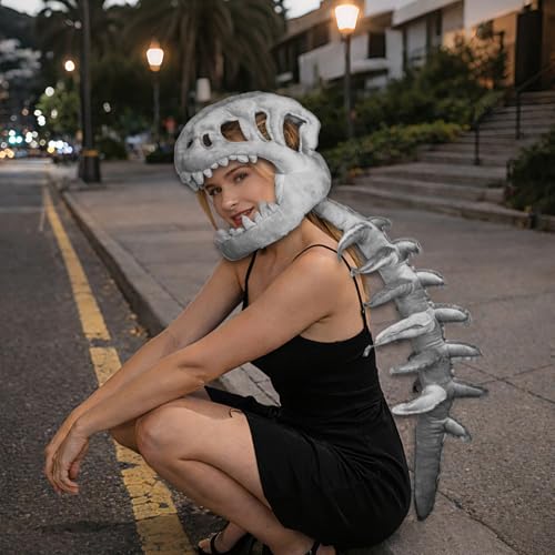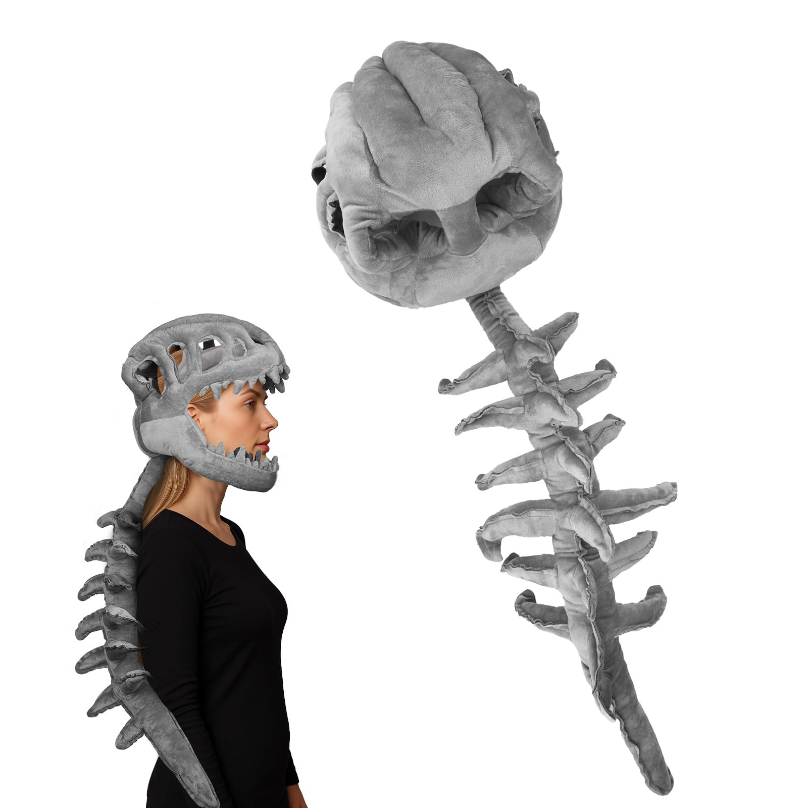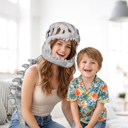 3D Wearable Realistic Skeleton Dinosaur Costume, Fun Short Furry Spinosaurus Skull Dino Bone Plush with Spine Extension for Kid Adult Halloween Cosplay Gifts and Themed Parties Outfits(Grey)