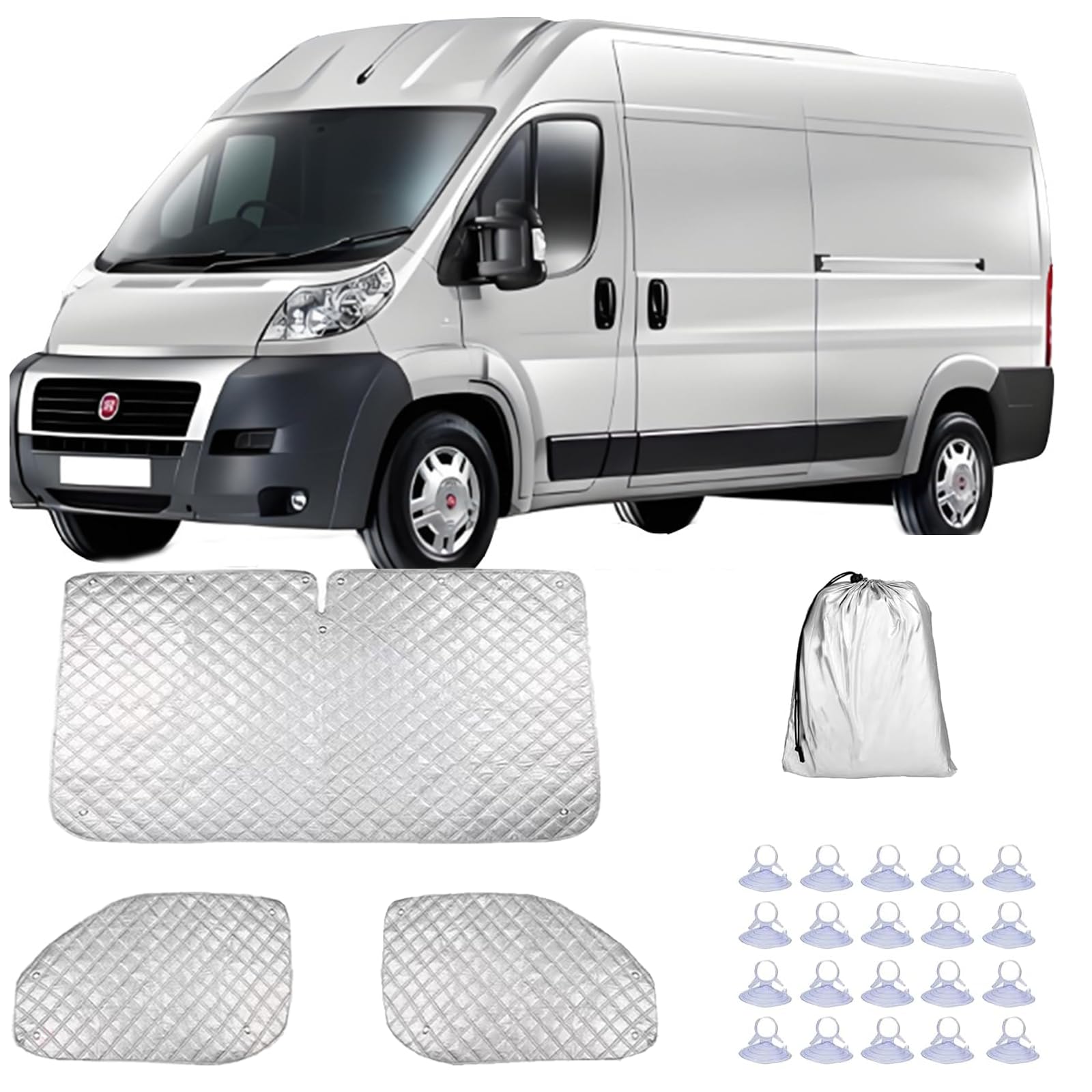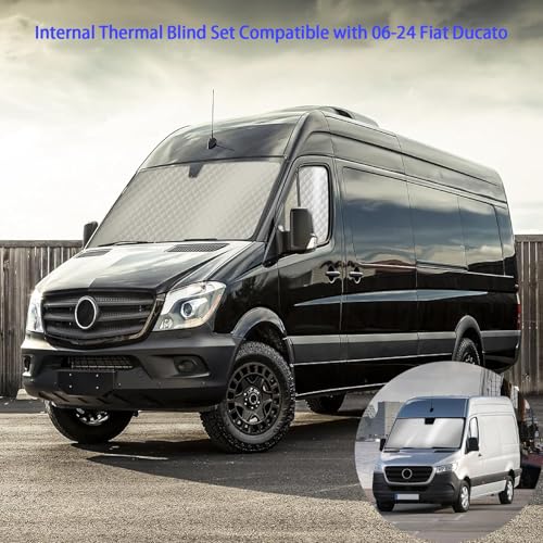 Internal Thermal Blind Compatible with Fiat Ducato: This set has 3 pieces exclusive compatible with 2006-2024 Fiat Ducato windscreen and window, ideal for campervans/motorhomes. It includes a full windscreen cover and two side window sunshades, covering all front glass. Each piece is precision-Compatible with Ducato’s window size—no gaps letting in sun/cold. Whether for weekend trips or long camping stays, it offers all-around protection.