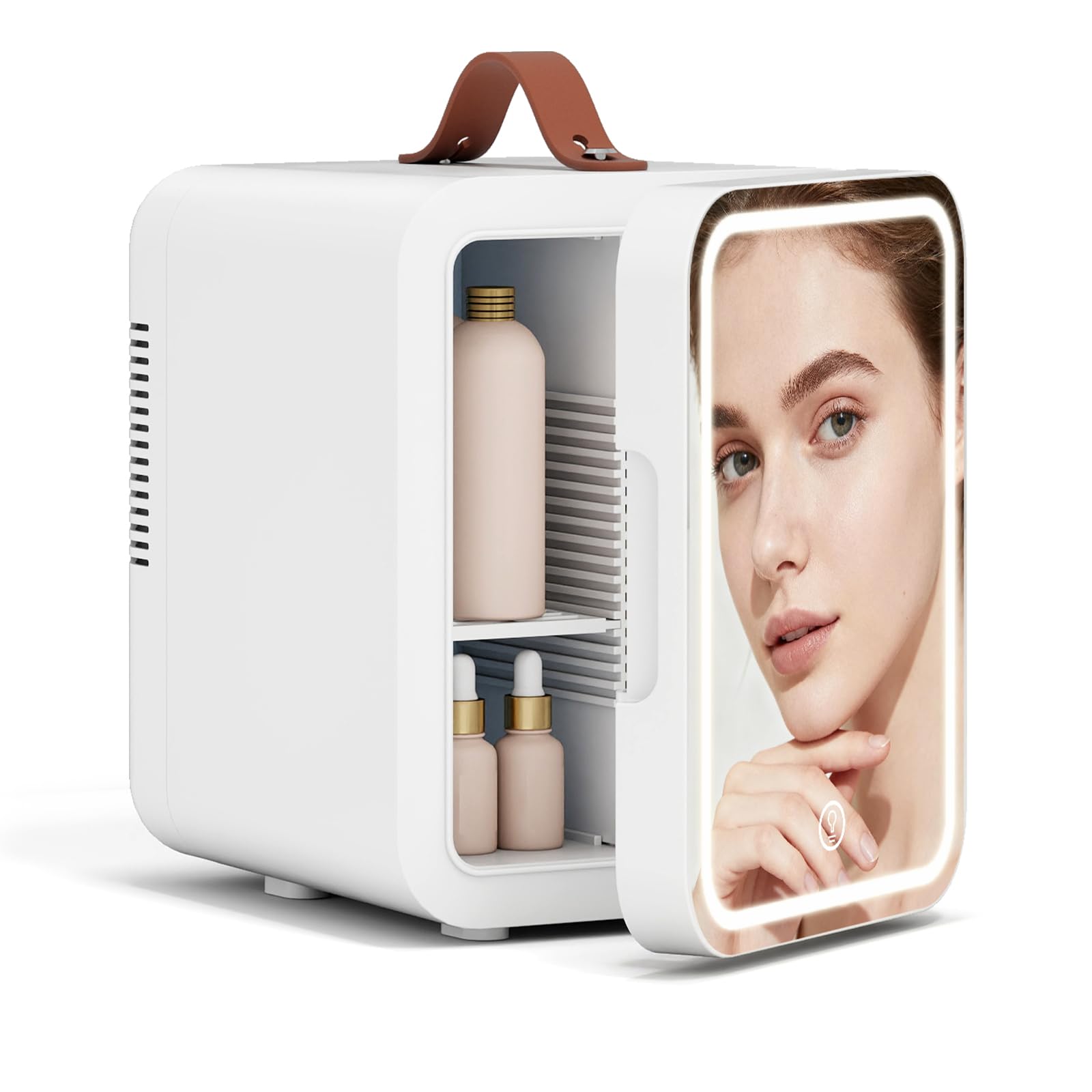 4 Liter Mini Fridge with Dimmable LED Mirror, AC/DC Beauty Fridge with Removable Shelf and Handle, for Makeup and Food, Skincare Fridge for Bedroom, Office, White[Energy Class F] [Energy Class F]