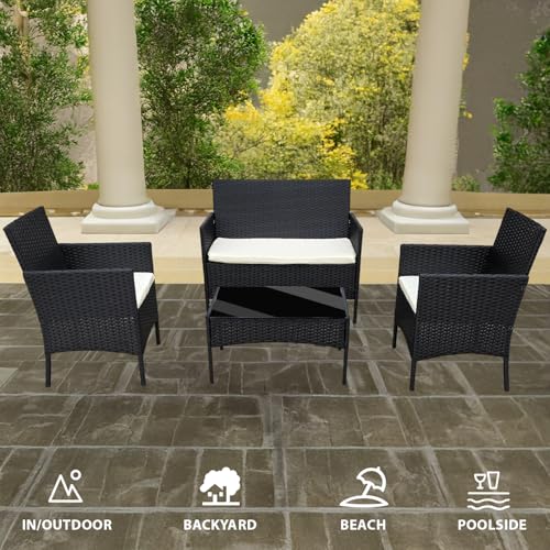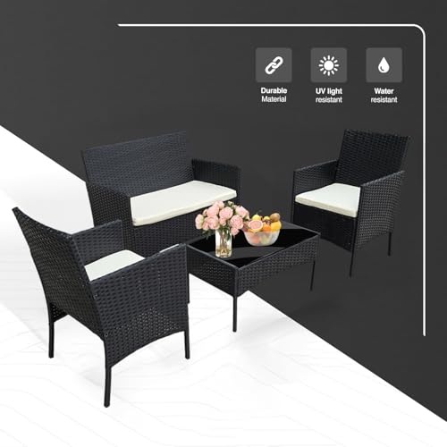 4-Piece Rattan Patio Furniture Set – Outdoor Wicker Sofa & Chairs with Coffee Table, Weather Resistant Garden Conversation Set for Patio, Backyard, or Poolside (Black + Beige Cushions)