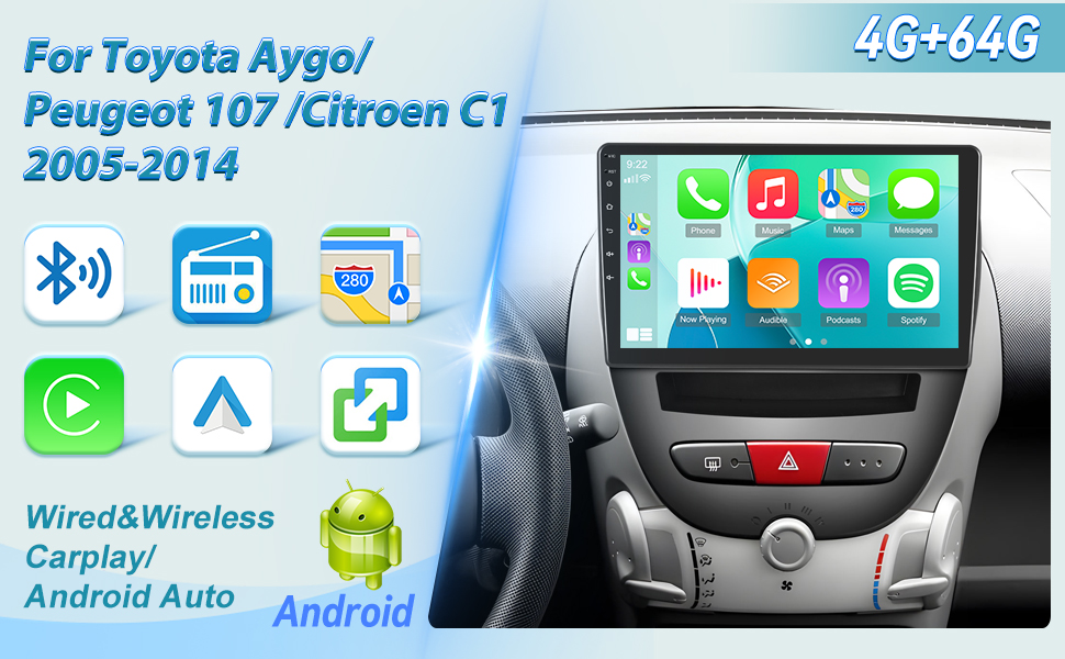 - 【Wired/Wireless Carplay & Andriod Auto & Mirror Link】This Toyota Aygo stereo is compatible with Carplay and Android Auto, support for Voice Control makes it easier to use phone functions, including music, GPS navigation, calls, messages and more, while you focus on the road. Mirror link to sync your smartphone to the Peugeot 107 screen
