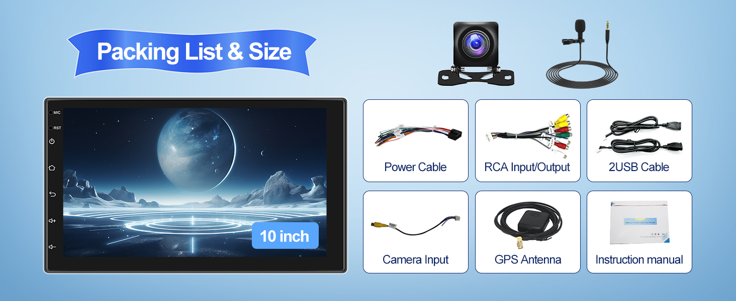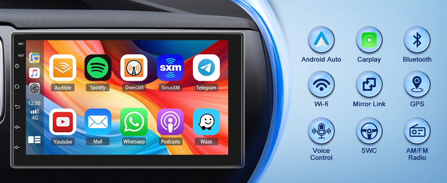 【Car Audio Multimedia Receiver】Car radio with Quad/4 cores high efficiency processor, perform 4G or WiFi / external MIC / APP download / split screen / car settings / GPS navigation / Carplay / FM / AM / RDS / DSP / Bluetooth/HD 1024P or IPS 1280P Video/steering wheel control/rearview camera/MP3/AUX/USB/support TPMS, OBD2, DVR, DAB+, etc extended equipment functions.