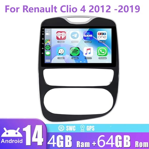4+64G Android 14 Car Stereo Radio for Renault Clio 4 2012 2013 2014 2015 2016 2017 2018 2019 with Wireless CarPlay Android Auto 10in IPS Touchscreen WiFi GPS Mirror Link Bluetooth FM/RDS