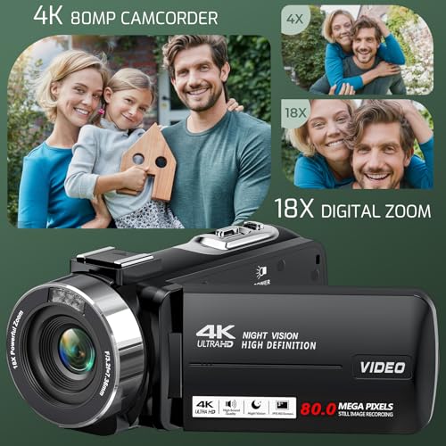 - 4K Ultra HD & 80MP Photography– Shoot crystal-clear 4K videos at 30FPS and capture detailed 80MP photos with this advanced digital camcorder. The 18X digital zoom lets you magnify distant subjects without losing clarity, making it perfect for wildlife, sports, and travel photography. The 3.0" rotatable IPS screen ensures flexible framing from any angle.