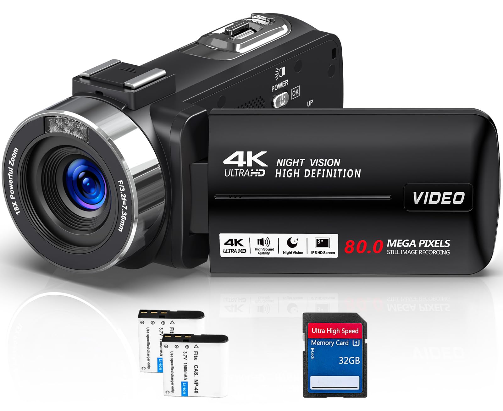 4K 80MP HD Video Camera with 18X Digital Zoom, Infrared Night Vision, 3.0″ Rotatable IPS Screen, Webcam Function, 2 Batteries & 32GB SD Card – Vlogging Camera for YouTube