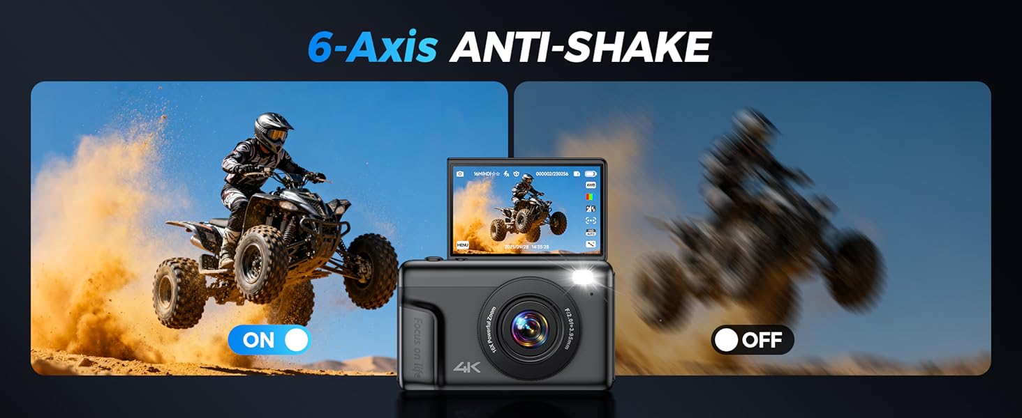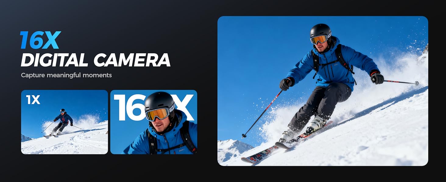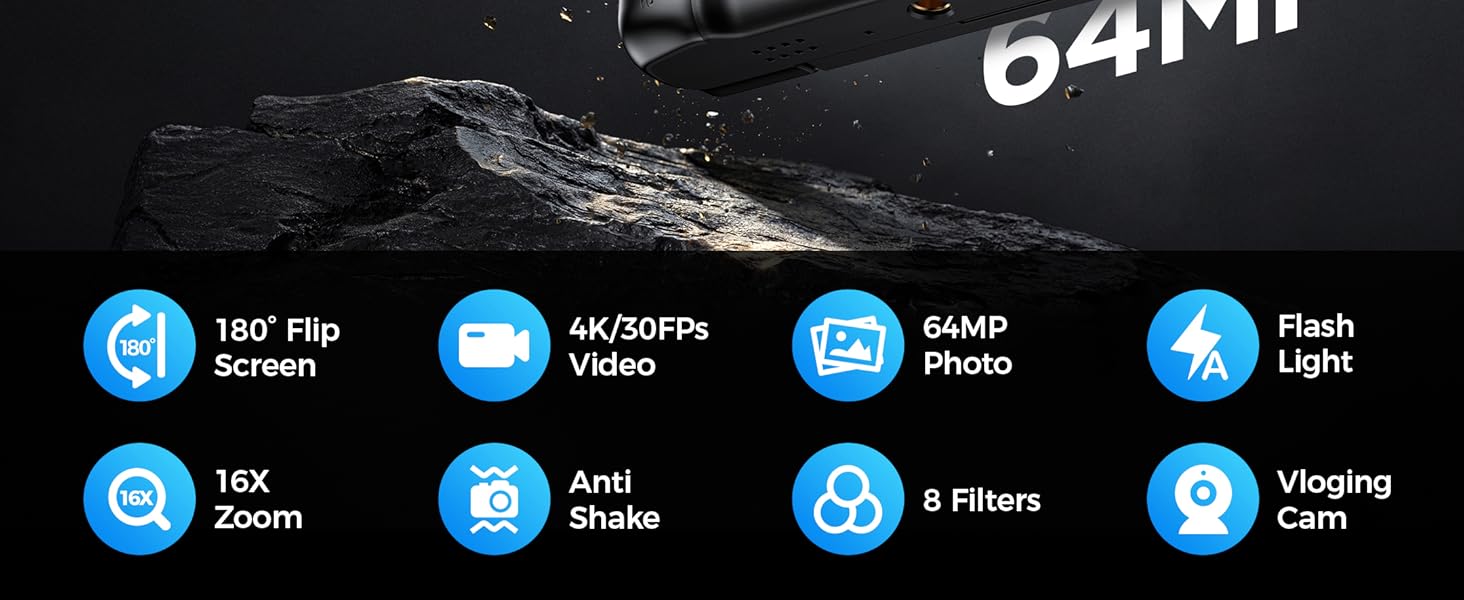 【Professional 64MP & 4K Quality】Advanced CMOS sensor, take razor-sharp photos with 64MP—every single drop of water on flowers is visible! The 16X digital zoom brings even distant birds close up. 4K videos show sunsets in perfect colour gradations. Night shots? The large sensor with image stabilisation enables bright, noise-free photos.