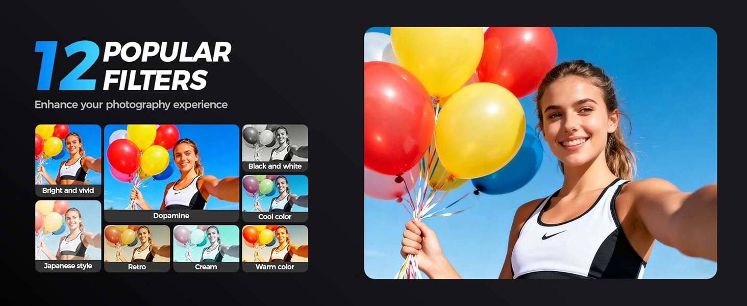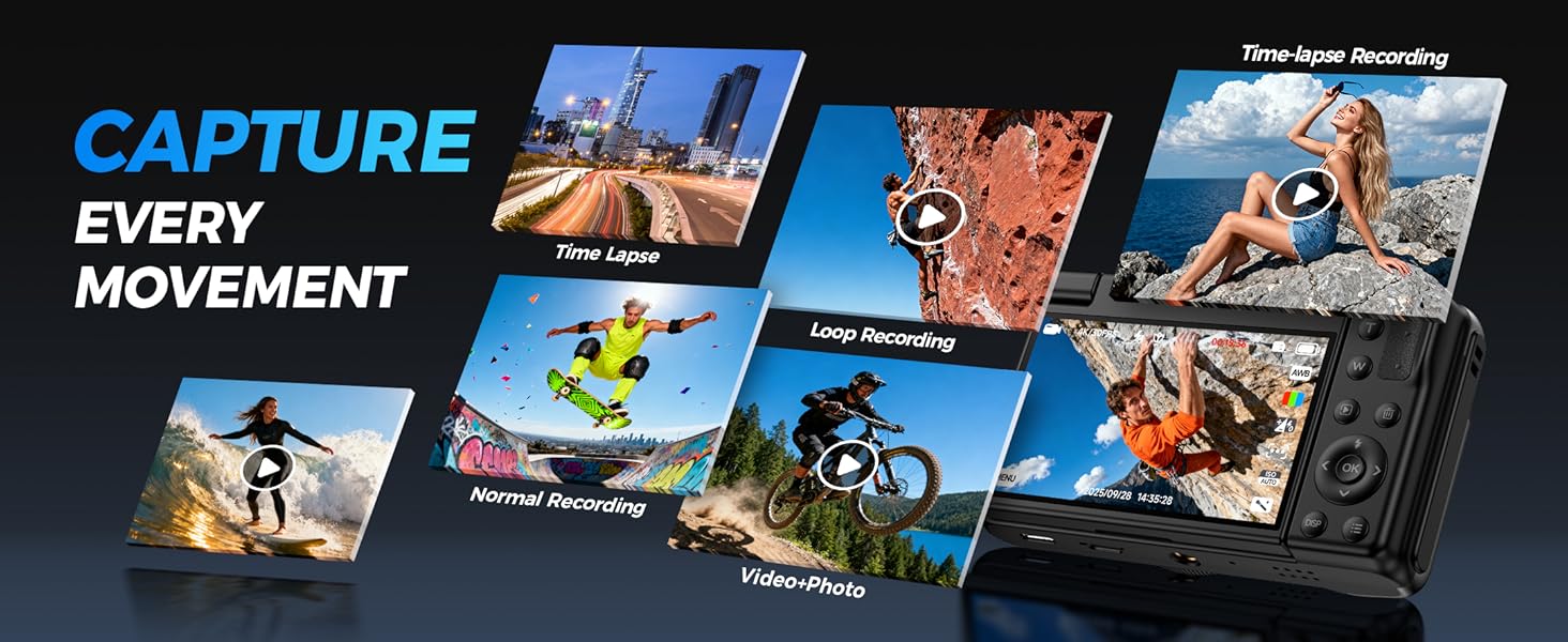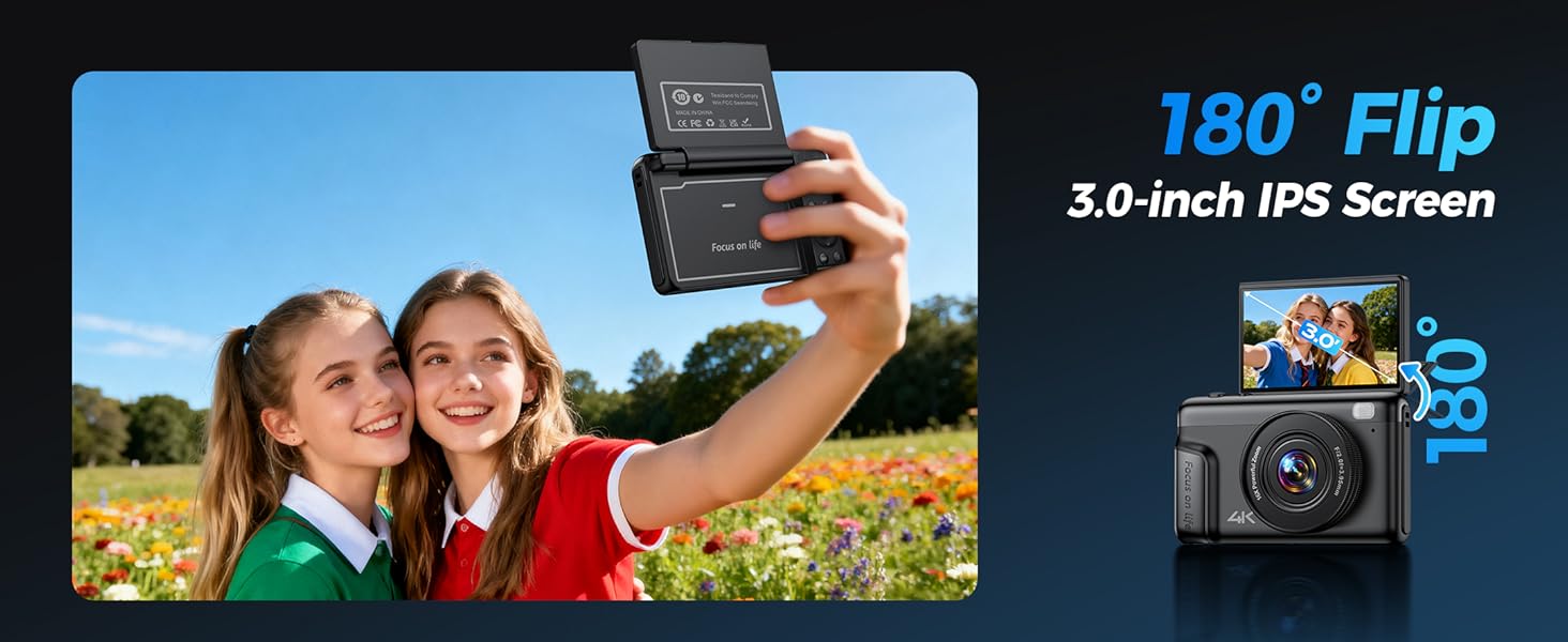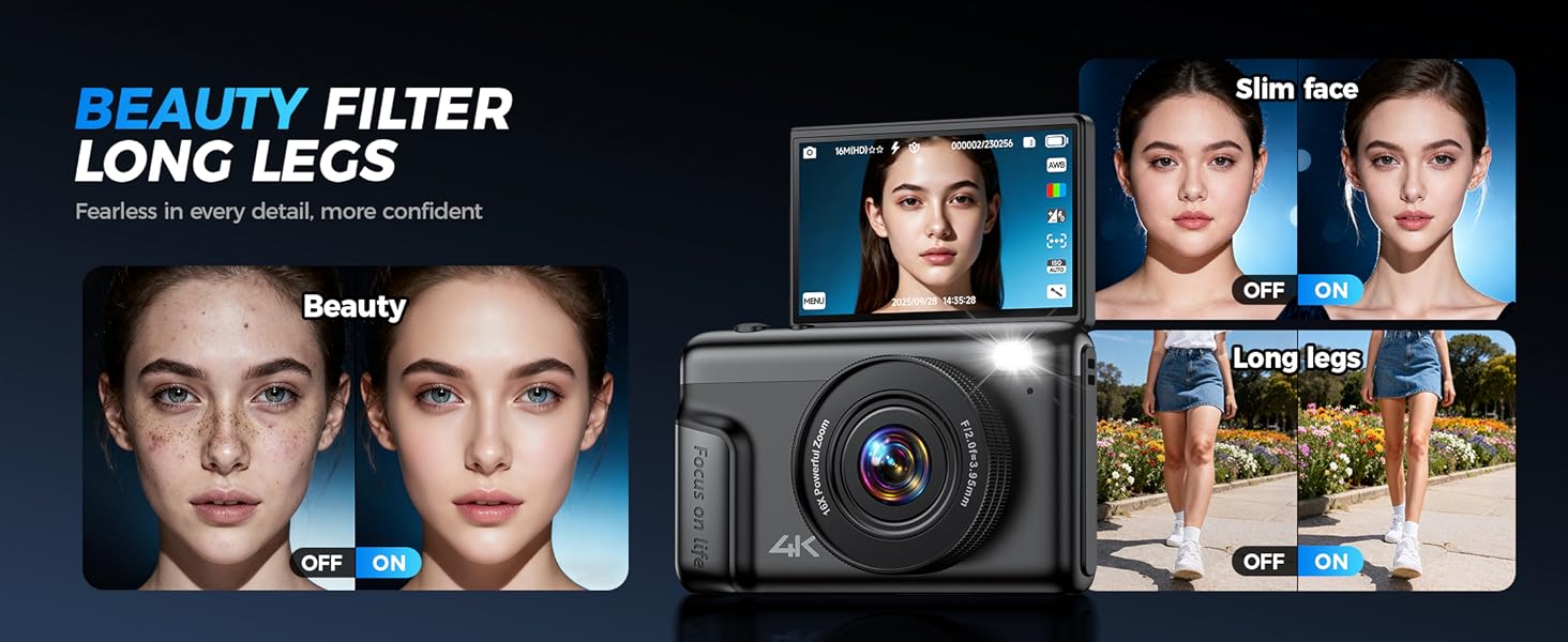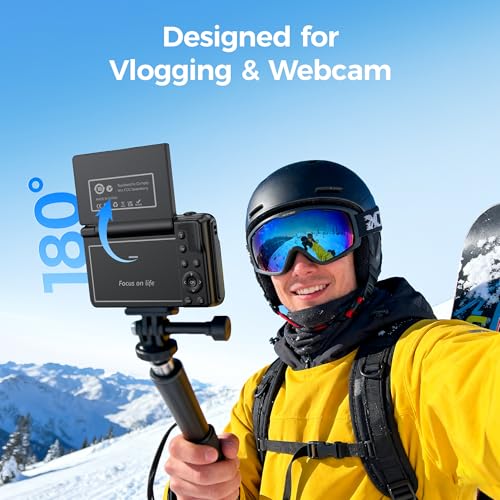 【180° Flip Screen Vlog Camera】Perfect for YouTube videos & TikTok posts: The 180° flip display always shows you how you look in the picture. Autofocus & Beauty Mode automatically smooths skin tones with 12 filters. Skin smoothing ensures perfect self-portraits. Even when walking, your videos remain smooth. For vloggers: your mobile video studio