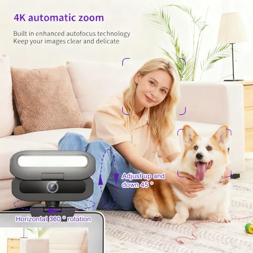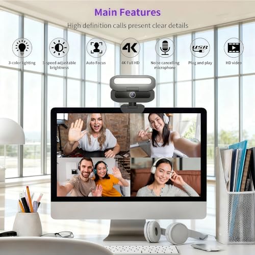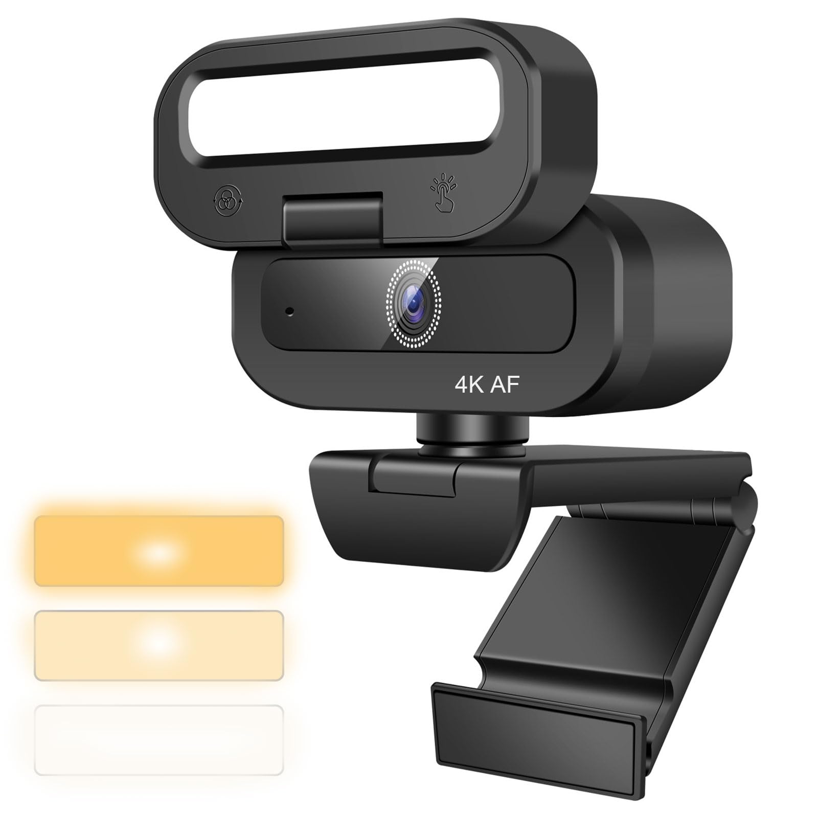 4K Webcam for PC, Webcam with Microphone & Light & Privacy Cover, Auto Focus, Plug and Play, for Desktop Computer/Laptop Conferencing and Video Calling