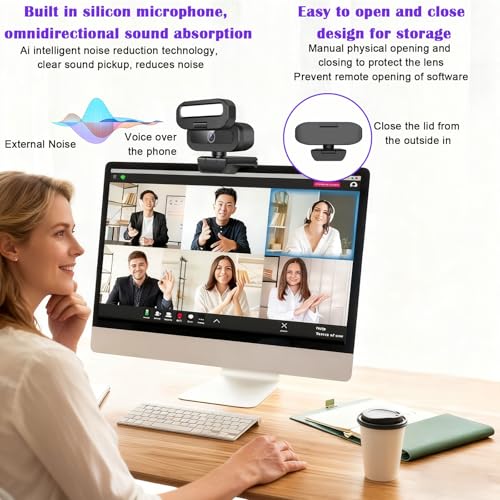 - 【Built in Noise Cancelling Microphone】: This Webcam for Laptop features a built-in silicon microphone with omnidirectional sound absorption and AI intelligent noise cancelling technology, providing clear sound pickup and reducing noise, making video calls clearer and not missing important content
