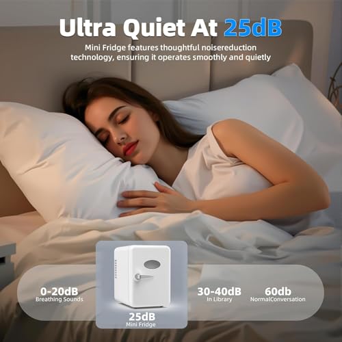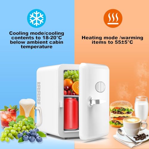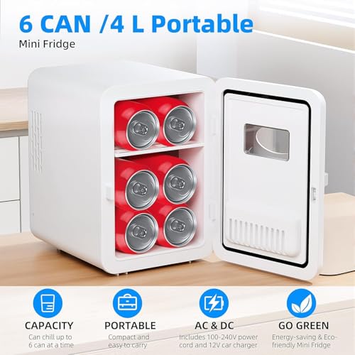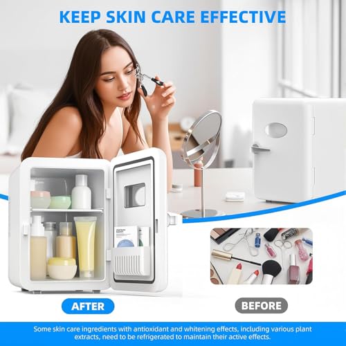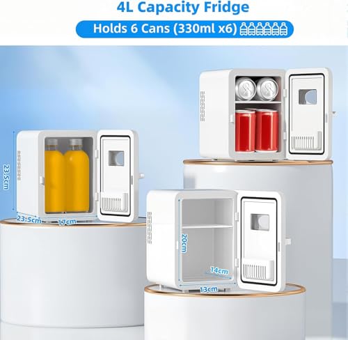 4L Mini Fridge: Compact yet mighty, the Vexloria Mini Fridge has a 4L capacity. It can store up to 6 cans, providing sufficient space for your beverages. Moreover, it serves as an ideal storage for delicate skincare products, makeup, cosmetics, and small snacks, adapting to a wide range of cooling needs.