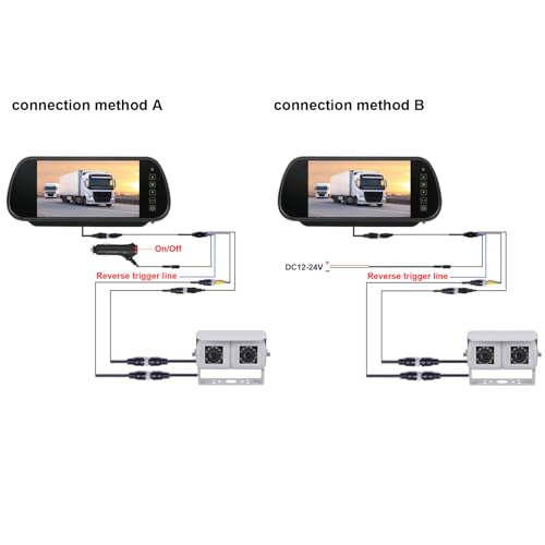 - White Twin lens Reversing Camera for Truck Caravan: This System is wired, 7 Inch IPS mirror monitor with Dual lens reverse camera + 2x 10M(33ft) 4Pin Extension cable.The truck backup camera is superior in signal stability compared to the wireless back up camera, and system is not affected by interference, no signal delays, interference, to ensure safer driving. The backup camera is widely used on DC 12V-24V vehicles, such as Trucks, RVs, Trailers, Bus, Pickup, Campers, Suv, Vans, Harvester, Motor Home, etc.,