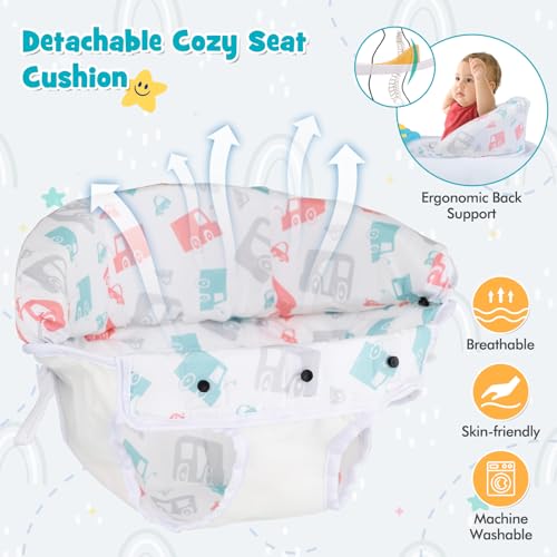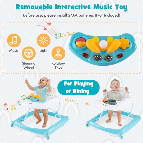Interactive Music Toy Station: Comes with detachable toy tray with melodies lights steering wheel and rotatory toys to stimulate sensory development remove the toy to use as a dining or play tray requires 2*AA batteries(not included).