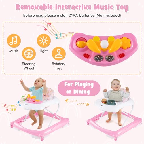 5-in-1 Baby Walker, Foldable Toddler Push Along Walker with 3 Adjustable Heights, Removable Padded Cushion and Music & Lights, Early Development Toy for 6-14 Months (Pink)