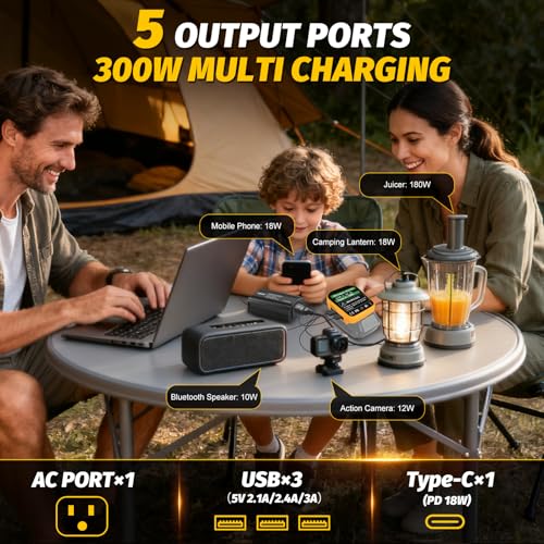 - 5 Ports 300W Power Inverter: Put your batteries into a power station to convert DC 18V to AC 220V starting your outdoor journey, equipped with 1x AC 220-230V output port,3x USB-A ports(5V, 2.1A, 2.4A, 3.0A),1x TYPE-C(PD3.0,18W)