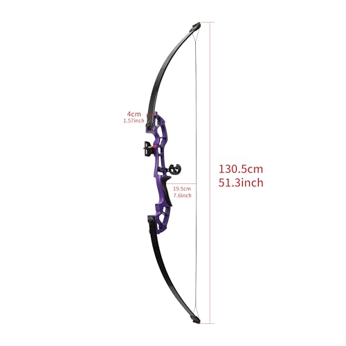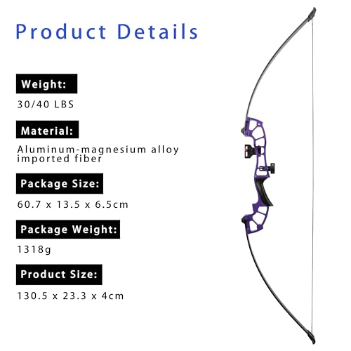 Product Details: Material: Aluminum-magnesium alloy + imported fiber Color: Black, Red, Blue, Silver,Purple Weight: 30/40/45/50 lbs Bow handle length: 44 cm String length: 131 cm String spacing: 30 cm Weight: 1119.2g Size: 130.5 x 23.3 x 4cm Weight with packaging: 1318g Packaging Size: 60.7 x 13.5 x 6.5cm Set: 1*Finger Tab 1*Arm Guard 1*Arrow Rest 1* Single Pin Sight 1* String Wax 6*500Spine Mixed Carbon Arrows 5*Target Paper 4*Target Pines Note: The above parameters are manually measured and may contain errors. They are for reference only. Please refer to the actual product for specific information.