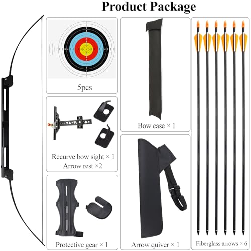 Product package: Bow × 1, fiberglass arrows × 6, target paper × 5, recurve bow sight × 1, recurve bow arrow rest ×1, finger guard × 1, arm guard × 1, arrow quiver × 1, bow case × 1.