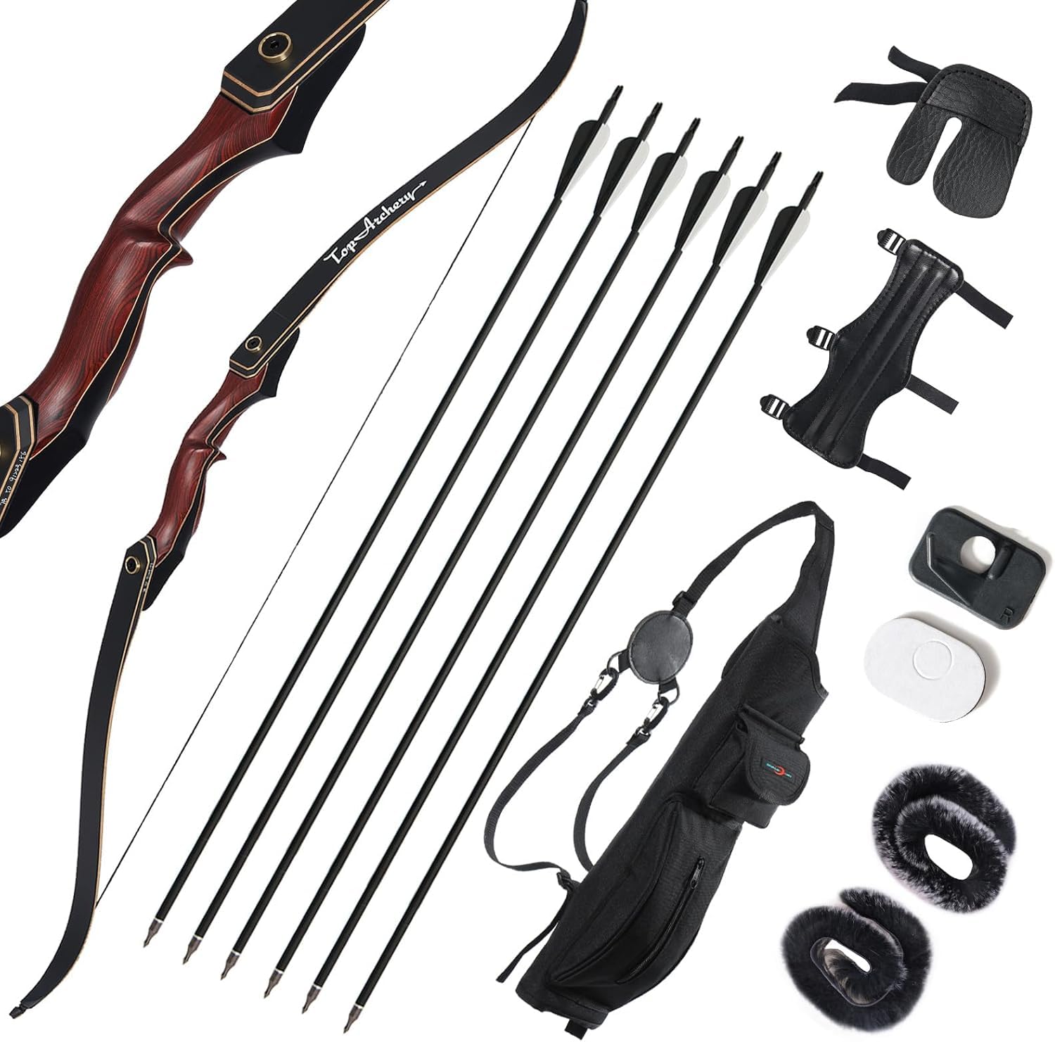 POWERFUL TAKEDOWN RECURVE BOW : Recurve bow made of ergonomically designed high-elastic fiberglass limbs and maple laminates. Bow string made of high quality natural tire line, more delicate and durable. Rounded edges and a fine finished wood handle which suit for beginner and professional archer.