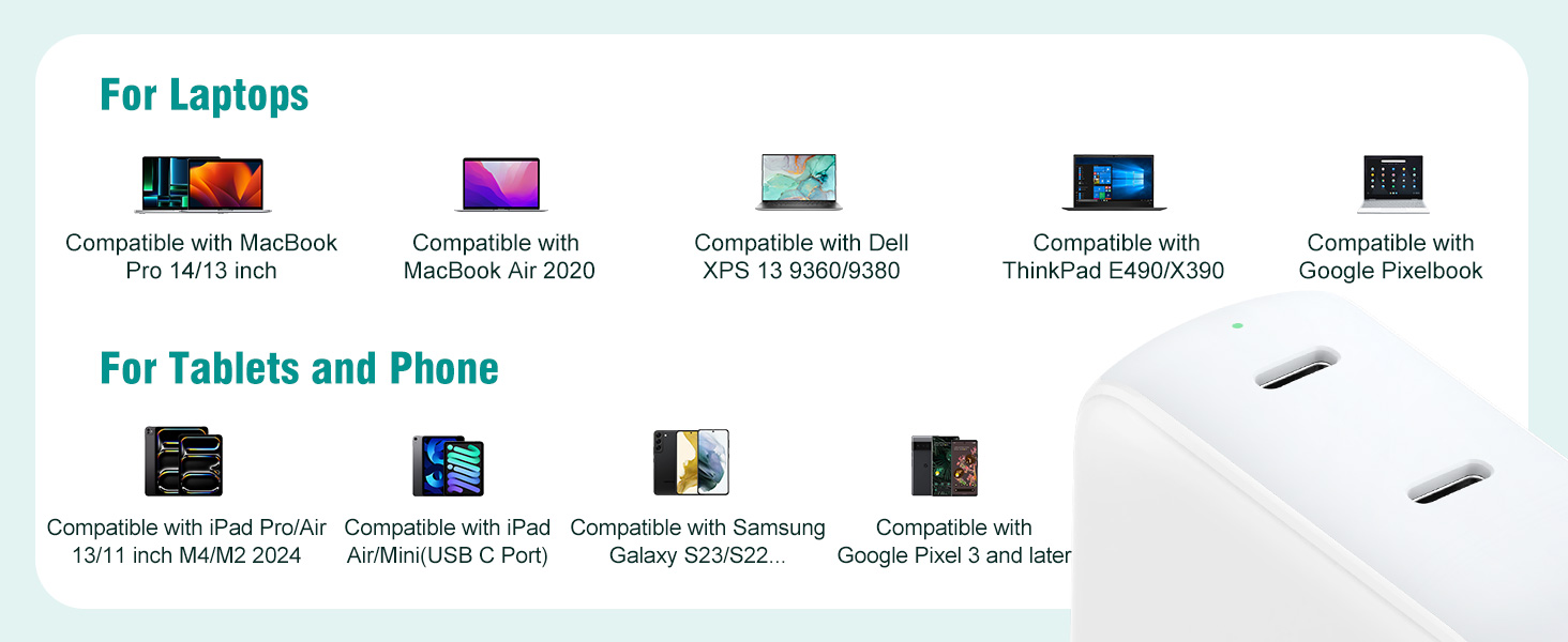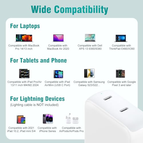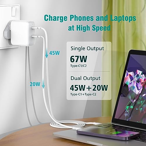 - Universal Compatibility: IFEART 67W Dual USB C Plug is compatible with MacBook Pro 13 14 15 16 inch 2024-2016, M1 M2 M3 M4 MacBook Air, 2024 M4 M2 iPad Pro/Air 13 11 inch, iPad Pro 12.9/11 inch, iPad Air 5/4, iPad Mini 6, iPad 10, iPhone 16 16Pro Plus Max, Galaxy s23/s22, Pixel, and other USB-C enabled device
