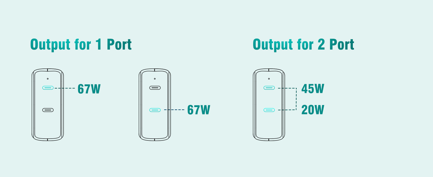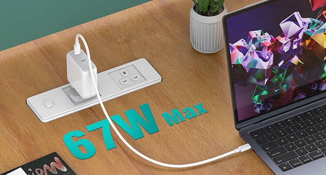 - With a maximum output power of 67W, most laptops, smartphones, switches and other USB-C devices can be charged quickly and efficiently.