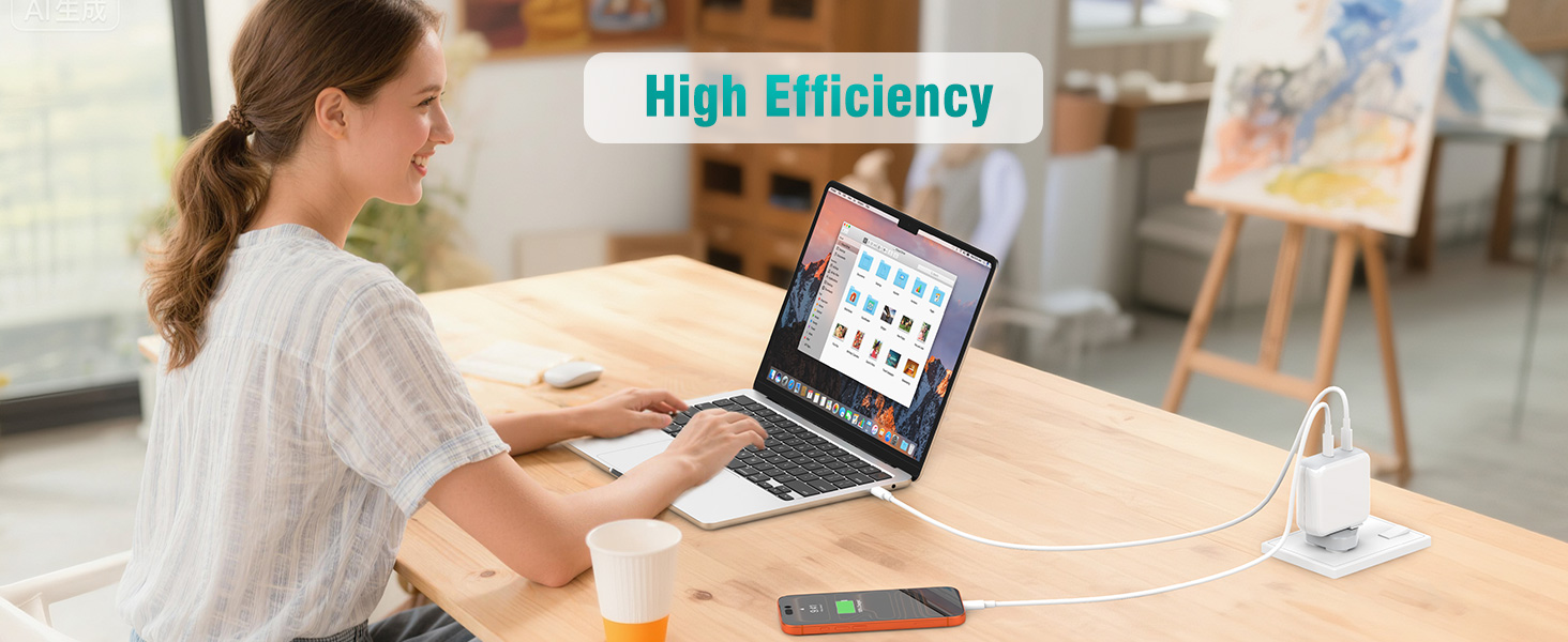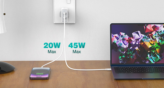 - 65W USB C Power Adapter 2 Port: Fast charge 2 devices at the same time with 65W total power, and this 67W USB C Charger is a perfect choice for time saving. When connect to dual ports, it supports 45W and 20W output to power your devices. For example, you can charge your MacBook Air 13" with 45W and iPhone 13 with 20W at the same time