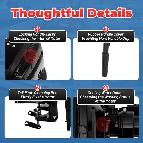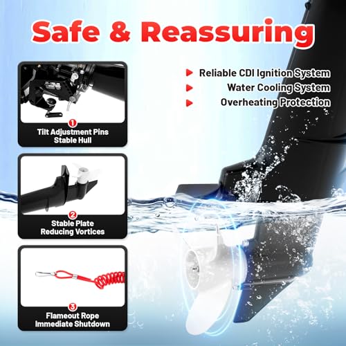 - Safe & Reassuring: The reliable CDI ignition system can quickly and safely start the motor, and suspension tilt adjustment pins and anti-vortex plates reduce inclination and vortices, ensuring smooth operation. The water cooling system is designed to maintain the optimal temperature, coupled with overheating protection, allowing you to continuously enjoy the fun of the navigation.