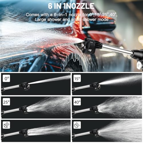 【6-in-1 Multi-Function Nozzler】This portable pressure washer features a versatile 6-in-1 nozzle. Its integrated design eliminates the need for changing attachments and includes multiple spray modes (0°, 10°, 25°, 40°, and shower mode) for easily handling a variety of cleaning tasks. It's perfect for watering plants, cleaning garden tools, bicycles, and boats. The included foam bottle creates rich foam for washing cars, removing stains from doors and windows, and cleaning hard-to-reach areas.