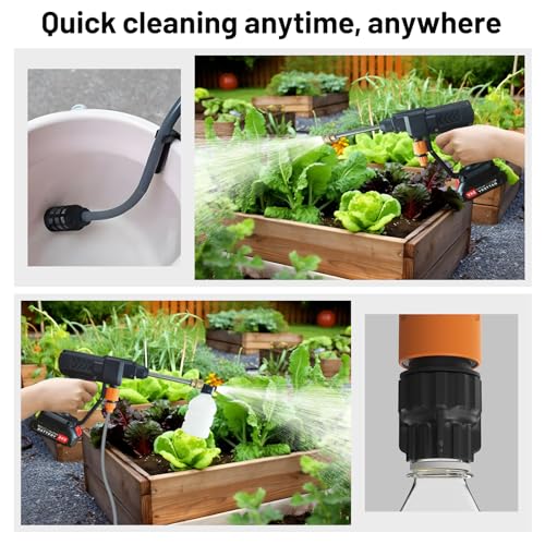 【Draw Water from Anywhere】 -High-pressure cordless washer features a lightweight, compact, and cordless design. Its 16-foot hose is equipped with a filter basket that effectively removes impurities such as sand, debris, leaves, and silt. This allows you to safely draw water from a bucket, pool, river, or any other source, protecting the pump and making it an ideal partner for outdoor cleaning tasks.