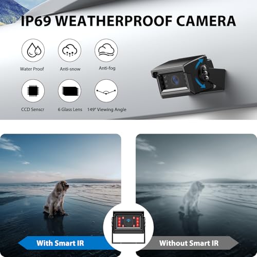 - High-Quality Heavy Duty Camera: The camera has 1080P resolution and provides ultra-clear color images.At night or dark place only need a little light can provide clear black and white picture. With a viewing Angle of 120° and an IP69K waterproof,it works perfectly in all weather. Its small design makes it very easy to install anywhere in the car, even in a narrow space. With Heavy duty, it also has an 8G vibration-proof rating and can operate normally under strong vibration.
