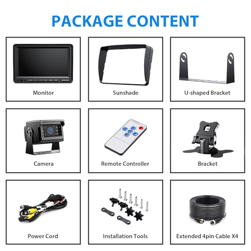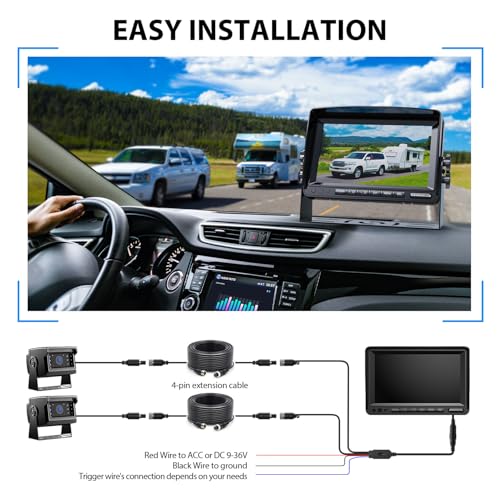 - More Functions : 1. The monitor is equipped with one trigger wire. When reversing, the monitor will automatically trigger to turn on and display the camera image. After reversing, the monitor will return to its previous mode. 2. The system offers two viewing modes: viewing when reversing, or continuously on. 3. It uses a waterproof aviation 4-pin threaded connector, and does not use BNC/RCA interfaces. 4. Easy to install.